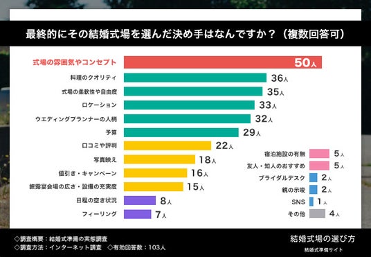 結婚式場を選んだ決め手は『式場の雰囲気やコンセプト』が50人で最多回答数