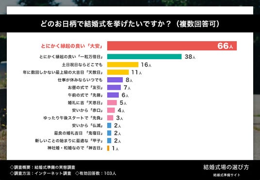 最後に「どのお日柄で結婚式を挙げたいですか?(複数回答可)」と質問したところ、『とにかく縁起の良い「大安」』(66人)が、他を大きく引き離してトップとなりました。また、近年注目度が高まっている『とにかく縁起の良い「一粒万倍日」』(38人)も2位に入っており、3位には縁起の良さとは対照的に『土日祝日ならどこでも』(16人)という現実的な回答が続きます。
