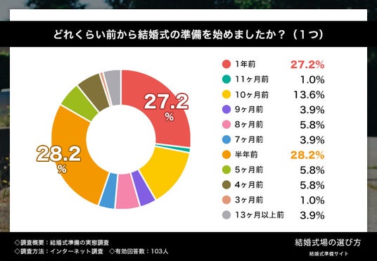 結婚式の準備『半年前』が28.2%で最多、次いで『1年前』で27.2%という結果に
