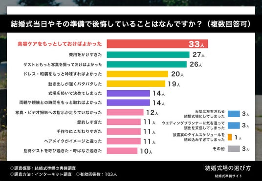 次に「結婚式当日やその準備で後悔していることはなんですか?(複数回答可)」と質問したところ、最も多かったのは『美容ケアをもっとしておけばよかった』(33人)という回答でした。続いて『費用をかけすぎた』(27人)が挙げられ、『ゲストともっと写真を撮っておけばよかった』(26人)という結果になりました。
