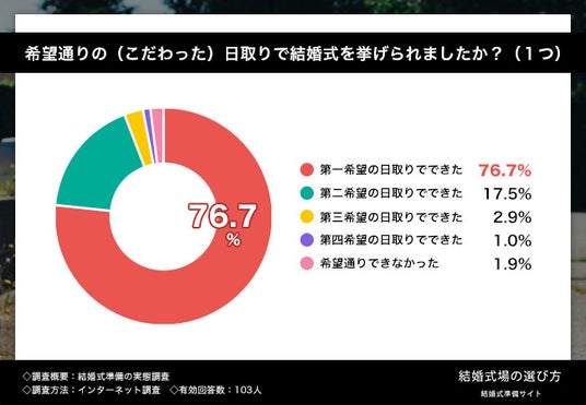 次に「希望通りの(こだわった)日取りで結婚式を挙げられましたか?」と質問したところ、全体の76.7%が『第一希望の日取りでできた』と回答し、多くのカップルが満足のいく日取りで式を挙げている実態が明らかになりました。一方で、2位『第二希望の日取りでできた』(17.5%)や3位『第三希望の日取りでできた』(2.9%)という声もありました。