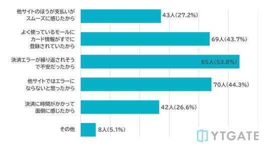 ・流出理由は「エラー再発への不安(53.8%)」「カード情報の登録済み環境(43.7%)」「他サイトでの正常動作期待(44.3%)」などが多数