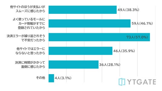 ・流出理由は「エラー再発への不安(57.0%)」「カード情報の登録済み環境(46.1%)」「支払いがスムーズだったから(38.3%)」などが多数