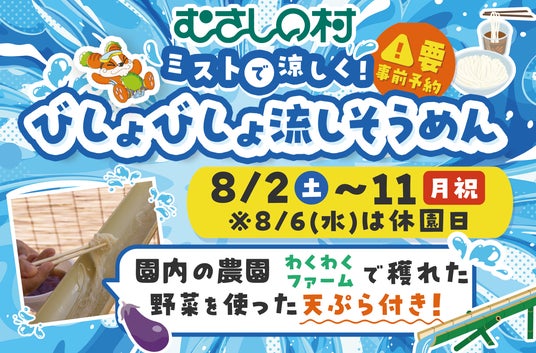 【遊園地むさしの村】採れたて野菜の天ぷら付!遊園地で夏を味わおう!「ミストで涼しく!びしょびしょ流しそうめん」8月2日から開催!(埼玉県加須市)