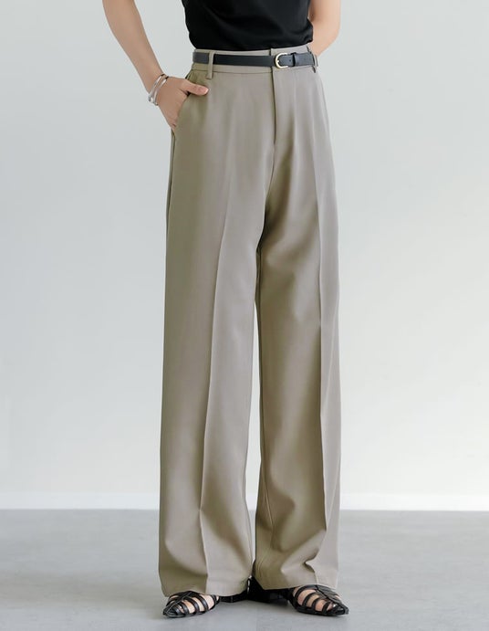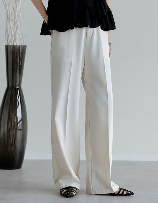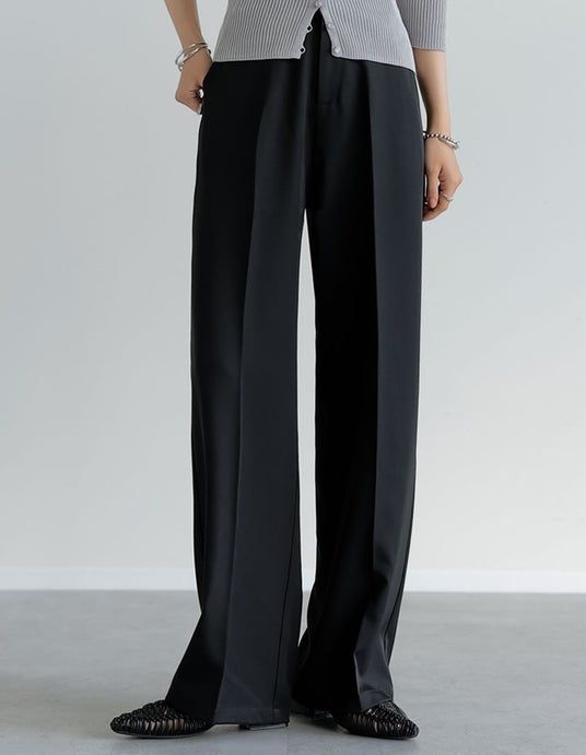 脚を長く見せるすっきりとしたセンタープレス入り&美しいストレートシルエットが高見え効果をプラス。