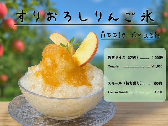 手間をかけた特製かき氷は2種ご用意。すりおろしりんごをたっぷり使った「すりおろしりんご氷 / Apple Crush」は、果実の爽やかさとふんわり氷の口どけがクセになる一品。
