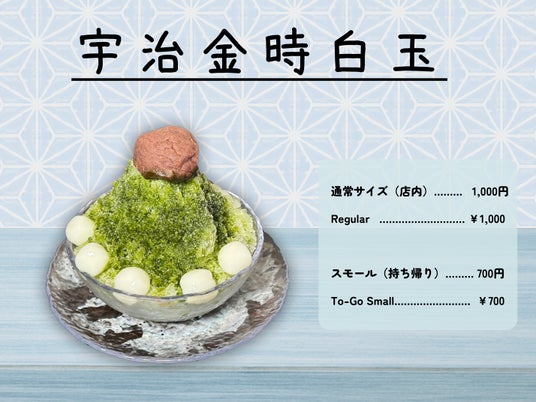 すりおろしりんご氷や宇治金時白玉(イートイン各1,000円/テイクアウト700円)に加え、夏祭りの定番7フレーバー(イチゴ、メロン、ブルーハワイ、ゆかり、梅、スイカ、はっさく)を各400円で提供。