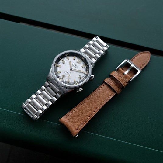 入荷と完売を繰り返す大人気のコラボモデルの新色「グリーンダイヤル」にバックルタイプのレザーベルトがとメタルベルトがセットになった特別なモデルを10本限定で発売します。上品な型押しモデルが腕元の品格を感じさせます。
