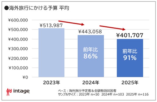 次は、今年の夏休みの「海外旅行」について詳しく見ていきましょう。海外旅行の予算は、2023年の平均513,987円から2024年の443,058円、そして今年は401,707円と、2年連続で減少しました。昨年から4万円減少し、前年の90.7%の金額です。また、一昨年と比べると、2割以上減少しています(図表4)。