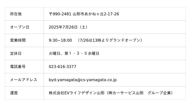 BYDの日本法人であるBYD Auto Japan株式会社(本社:神奈川県横浜市、代表取締役社長:東福寺 厚樹、略称:BAJ)の正規ディーラーである株式会社EVライフデザイン山形(本社:山形県山形市、代表取締役社長:小川 大輔)は、2025年7月26日(土)に、全国で43店舗目、山形県初となるショールームを備えた正規ディーラー店舗「BYD AUTO 山形」をオープンします。