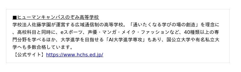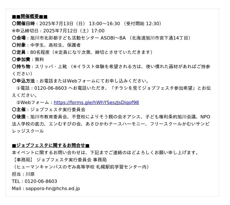 「通いたくなる学びの場の創造」を理念に、高校科目と同時に、声優・マンガ・メイク・ファッションなど、40種類以上の専門分野を学べる広域通信制の高等学校、学校法人佐藤学園ヒューマンキャンパスのぞみ高等学校(以下、「当校」)は、 2025年7月13日(日)に、中学生・高校生を対象とした職業体験イベント「ジョブフェスタ」を、旭川市北彩都子ども活動センター ASOBI~BAにて開催いたします。本イベントは、中高生が職業体験を通じて仕事への理解を深め、やりがいや楽しさを実感することで、自身の将来について具体的に考えるきっかけを提供することを目的としています。