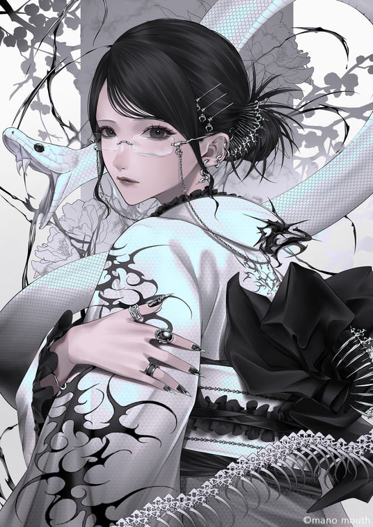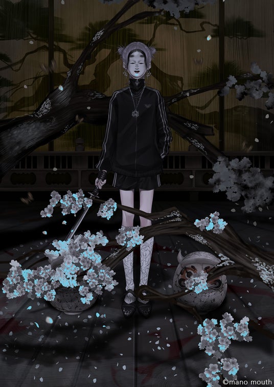 mano mouth氏の作品は、儚く、繊細でありながら力強さも感じる独自の世界観で注目を集めています。キャラクターデザイン、イラスト、GIFアニメーション、アパレルデザイン、CDジャケット……などなど、幅広いフィールドで活躍中。X(旧Twitter)でもフォロワー7万人を抱える、人気クリエイターです。