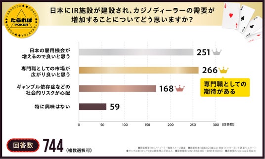 日本で2029年開業予定の大阪IRにより、そこで働く人の需要もあり雇用の道も開かれますが、「カジノディーラーの需要が増加すること」についての意識調査を実施したところ、最も回答数の多かったのは「専門職としての市場が広がり良いと思う」(266票)と、高いスキルが必要とされる専門職としての期待が大きいことが分かりました。