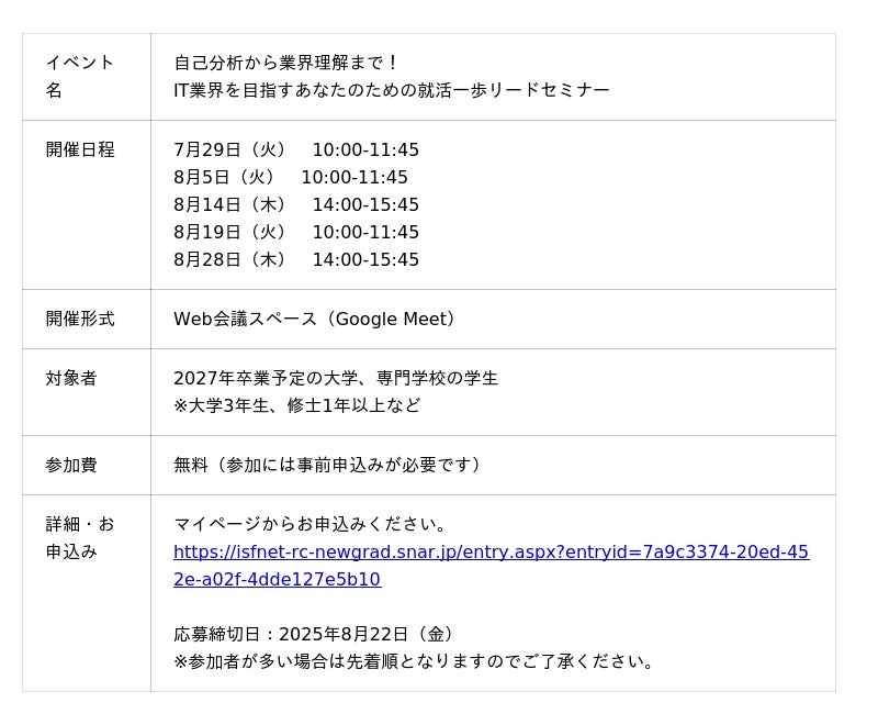 株式会社アイエスエフネット(本社:東京都港区/代表取締役:渡邉幸義、以下アイエスエフネット)は、2027年に卒業を予定する学生を対象に、「自己分析から業界理解まで!IT業界を目指すあなたのための就活一歩リードセミナー」を開催いたします。本イベントは、文理問わずIT業界を目指す学生が、業界への理解や就職活動に役立つ情報を得られるイベントとなり、7月末から8月末の期間に開催いたします。