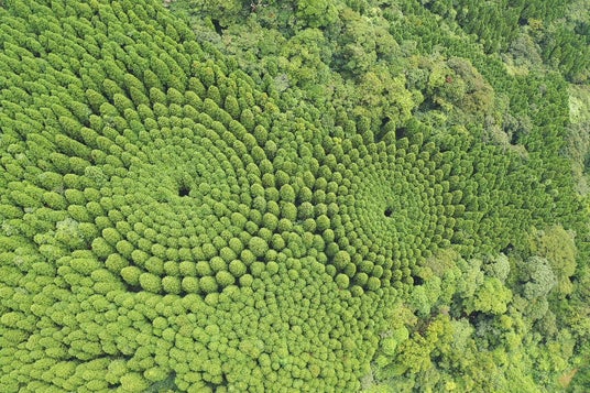 当時、このエリアでは植栽密度の違いが樹木の成長に与える影響を調べるため、杉の苗を放射状に間隔を変えて植えるという実験が行われました。その結果、樹木の成長速度や密度によって、上空から見ると規則的なサークル状の濃淡が浮かび上がるという、思いがけないビジュアルが生まれました。