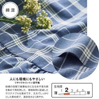 ワンピースに使用している「リサイクルコットン」は、紡績や縫製の過程で廃棄される不均一な糸や落ち綿、裁断くずを再利用して、新たに糸として生まれ変わらせた素材です。環境への負荷を抑えつつ、わずかにネップ(糸の節)などを含むナチュラルな風合いをお楽しみいただけます。