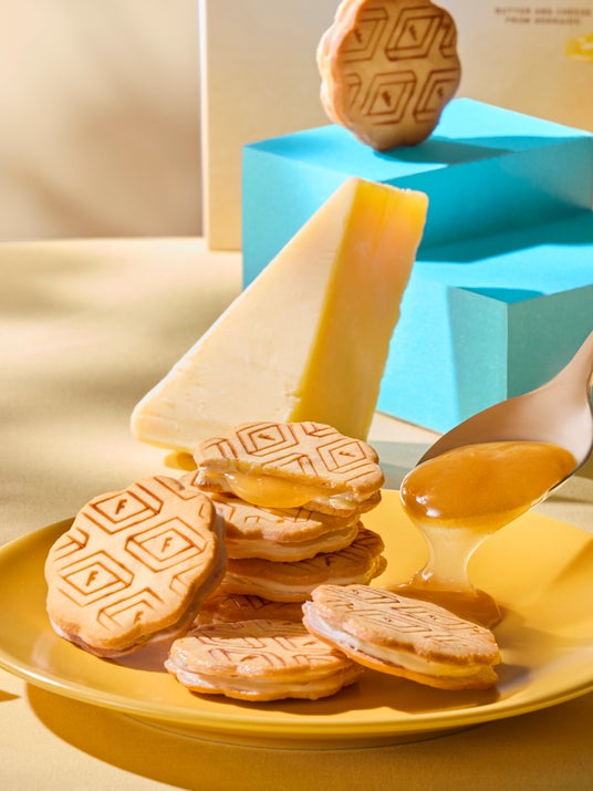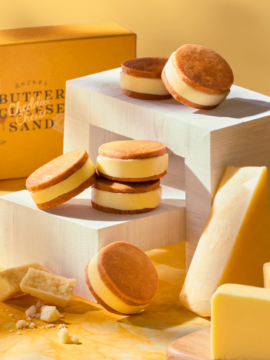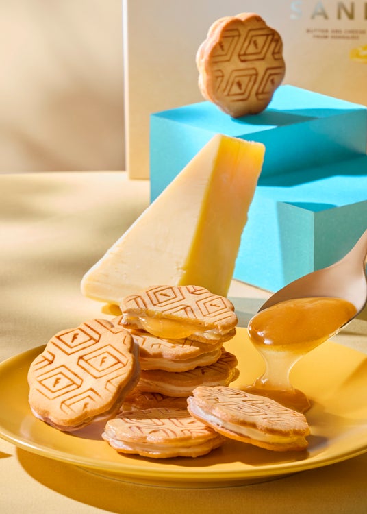 北海道の素材のおいしさを生かしておつくりした新千歳空港限定味「チェダーチーズ」のバターチーズサンド。北海道美瑛小麦を使ったサクッホロのサブレで、北海道バターとチェダーチーズを合せた風味豊かなクリームをサンドしました。