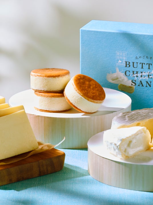 美瑛産ジャージー牛乳とカマンベールチーズを、たっぷり芳醇な北海道バターを使用したバター&チーズクリームと合せたバターチーズサンドです。ベースのクリームは、北海道産のバターにしっかり空気を抱かせて軽めの食感に仕立てました。そこに北海道産カマンベール&マスカルポーネチーズを合わせることでうま味が増し、よりまろやかで風味豊かな味わいに仕上げました。