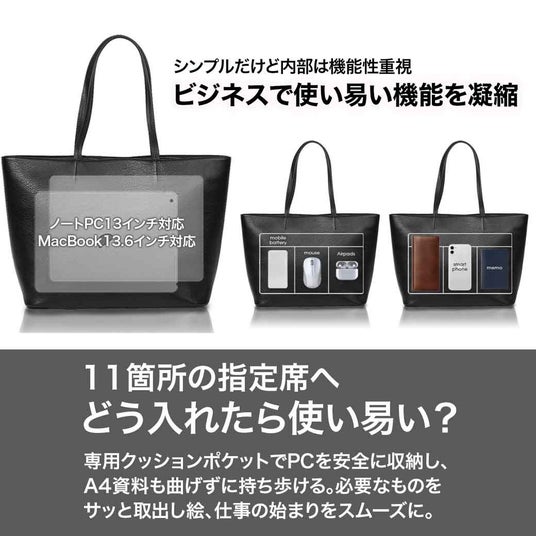 さらに、PCや書類、プレゼン資料、ケーブル類までをすっきり収納できる11の専用ポケットを装備。デバイスの取り出しもスムーズに行え、仕事のスタートをスピーディに。耐水性のあるシボ革風PU素材を使用し、見た目の上質さと実用性を両立しました。