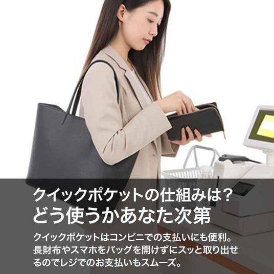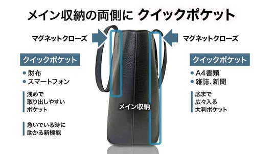 ビジネスパーソンの通勤・仕事・帰宅までの行動を徹底的に観察・分析して設計された「エクスビズトート」は、"スマートに取り出せる"を追求したマグネット式クイックポケットを2つ搭載。改札やレジ前での「探す」「慌てる」といった小さなストレスを解消します。