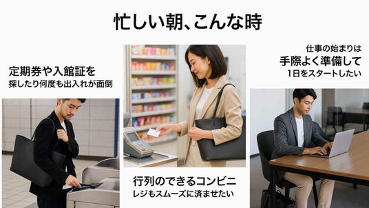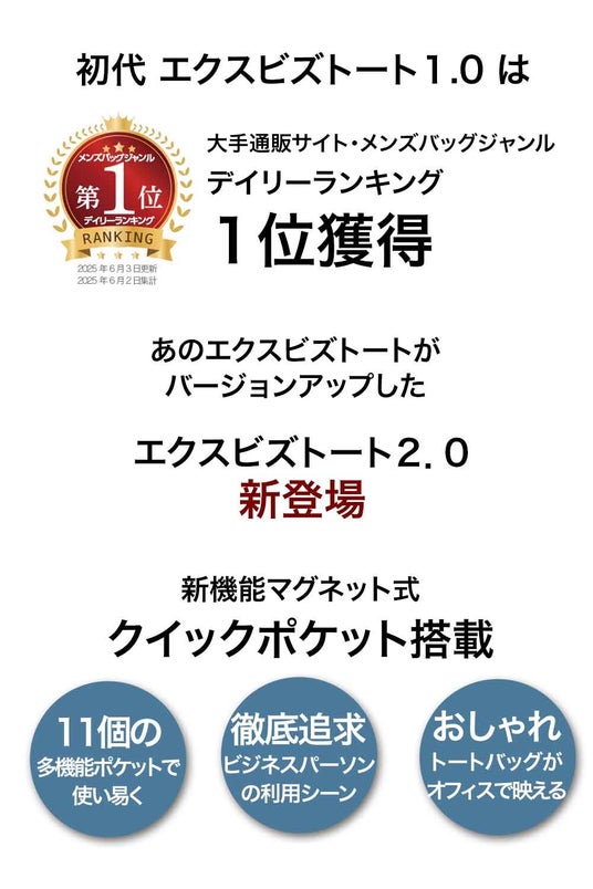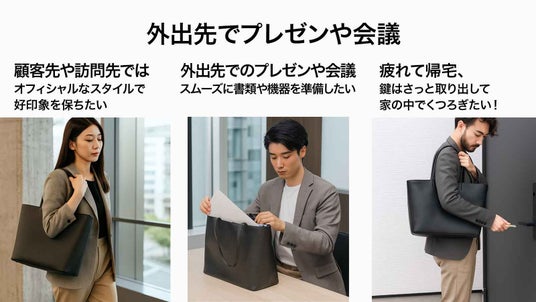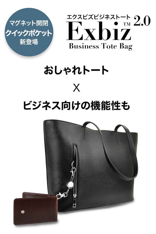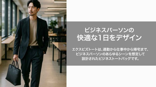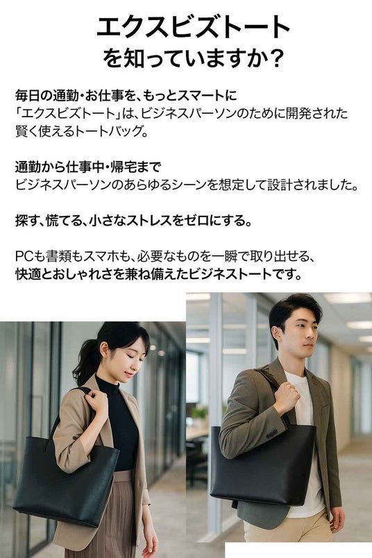 "通勤で使うのはもったいない"、そんな声もあがる、「探す・慌てるをゼロにする」、新時代の通勤バッグ「エクスビズトート」です。