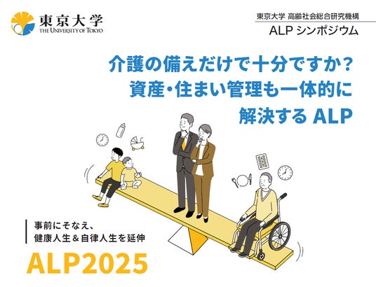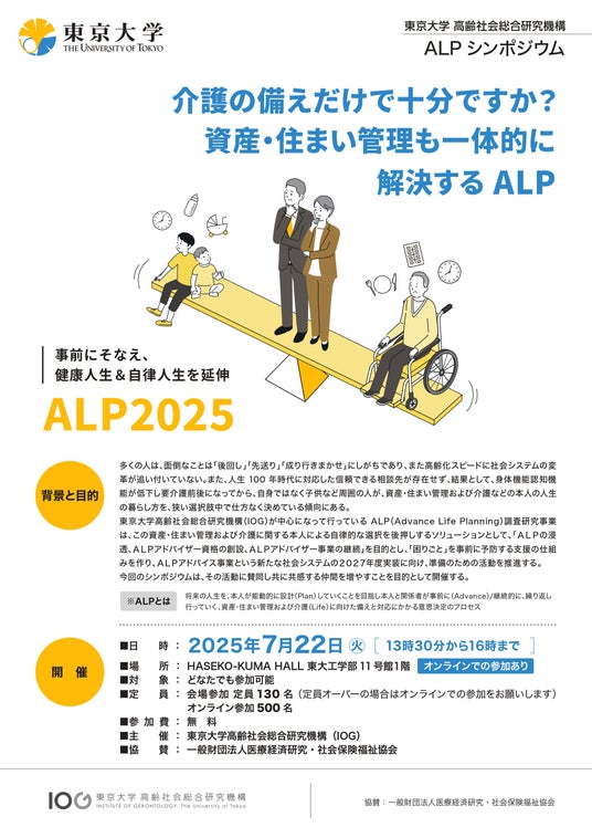 東京大学高齢者社会総合研究機構(所在地:東京都文京区本郷7-3-1 機構長:飯島勝矢)は、『介護の備えだけで十分ですか?資産・住まい管理も一体的に解決する ALP ー事前にそなえ、健康人生&自律人生を延伸ー』を2025年7月22日(火)13時30分~に開催します。
