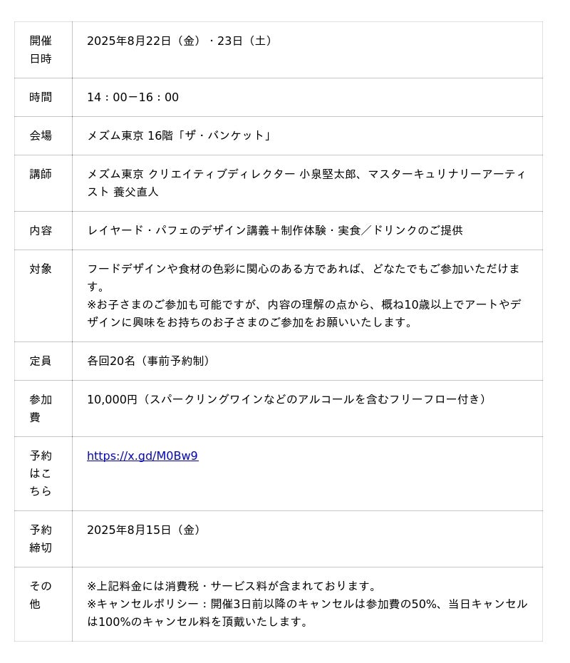 本プログラムでは、メズム東京の人気スイーツ「レイヤード・パフェ」を題材に、色彩の調和や構成の美しさを学びながら、ご自身の感性を活かした唯一無二の一品を創作していただきます。講師を務めるのは、メズム東京のクリエイティブディレクター 小泉堅太郎。食材の色合いや質感に宿るインスピレーションを手がかりに、"食べるアート"の世界へと丁寧にご案内いたします。