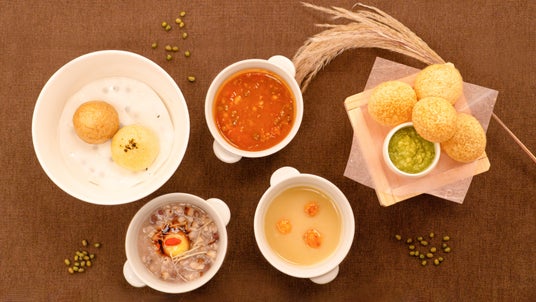 軽やかなパニプリを、パクチー香るムング豆のキチャリに付けてお楽しみいただけます