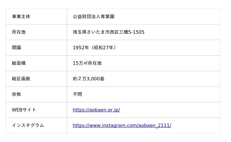 青葉園は、昭和27年に開園した日本初の民営公園墓地です。昭和32年に「財団法人」の認可を受け、平成27年に「公益財団法人」に移行。埼玉県内で、公益財団法人が運営する2つの霊園のうちの1つです。