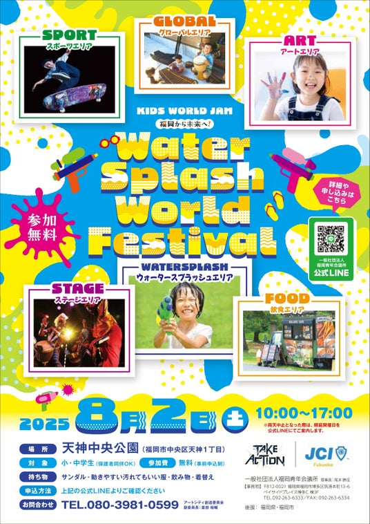 夏休みの予定はコレで決まり!一般社団法人 福岡青年会議所は、2025年8月2日(土)に天神中央公園にて、夏にぴったりの一大イベント「KIDS WORLD JAM~福岡から未来へ!~ Water Splash World Festival」を開催いたします!