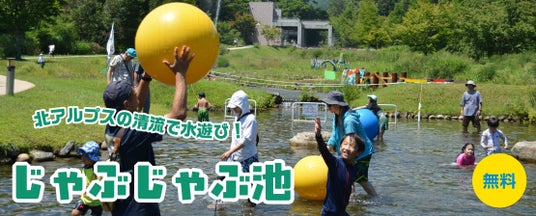 北アルプスから流れ出た清流の池での水遊び。大玉に加え、無料で水鉄砲などの水遊び遊具を自由に使って遊んでいただけます。