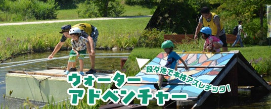 段々に広がる池を利用し、水上アスレチックを設置。水を存分に楽しめる本格アスレチックイベントを実施。