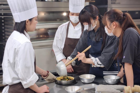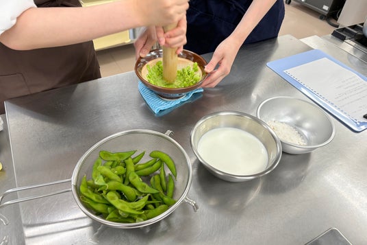 「枝豆のグリーンクリームソースパスタ」は学生が濃厚なクリームパスタをイメージするなか、枝豆のでんぷん質が影響し、ソースが時間の経過とともに固まってしまうという課題に直面。チーズエッグガーデンでの最終試食会にて改良を重ね、ブイヨンでソースを緩くし、さっと和えて盛り付けることで、ようやく学生のイメージに近いソースが完成しました。