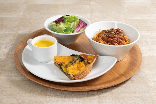 野菜たっぷりのキッシュ、ハーフパスタ&サラダ&季節の冷製スープも一緒に味わえる贅沢なプレートセットです。