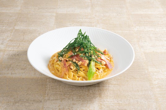 ペーストにした落花生を加えたカルボナーラ風パスタ。