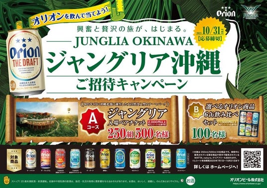 - キャンペーン名:オリオンを飲んで当てよう!ジャングリア沖縄ご招待キャンペーン- 応募方法:対象商品を、各コース既定の金額(Aコース:2,000円以上/Bコース:1,000円以上)ご購入のレシートでご応募いただけます。キャンペーンパック中面の応募ハガキ、または専用WEBサイトからの応募が可能です。