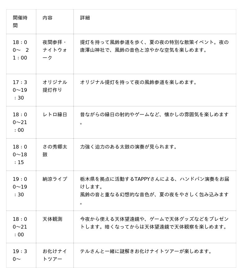 【特別イベント】2025年8月9日(土)・10日(日) 夜間参拝や風鈴参道のナイトウォーク、オリジナル提灯作り、レトロ縁日、太鼓演奏やハンドパンの納涼ライブ、天体観測、そして謎解きお化けナイトツアーなど、夜の唐澤山を楽しむ多彩な催しをご用意しております。