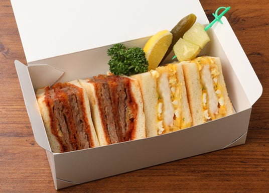 「牛ヒレダブルカツサンドウイッチ」と「えびフライのサンドウイッチ」のコンビ ※実際のご提供はテイクアウトボックス