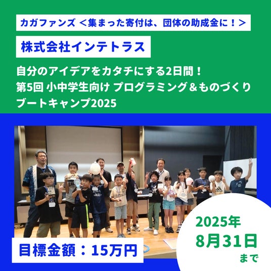 石川県加賀市をフィールドに活動する公益財団法人あくるめは、加賀での挑戦をみんなで応援するクラウドファンディングサービス「KAGA LOCAL FUNDING(カガファンズ)」のプロジェクト第五弾として、株式会社インテトラスの「自分のアイデアをカタチにする2日間! 第5回 小中学生向け プログラミング&ものづくりブートキャンプ2025」を採択いたしました。