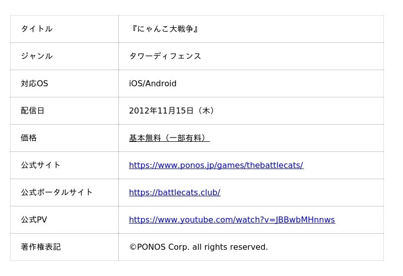 ポノスは、1990年の創業以来一貫してゲームを通してエンターテインメントという文化の発展に貢献してまいりました。【求められるモノは創らない、それ以上を創り出す。】を掲げ、求められるモノの中に、自分たちしか創れない価値をプラスしていくことを私たちは大切にしています。現在は、スマートデバイス向けのオリジナルゲーム開発を核に事業を展開し、代表タイトル『にゃんこ大戦争』は、累計DL1億回(2025年2月現在)を超え、多くのお客様に楽しんでいただいております。