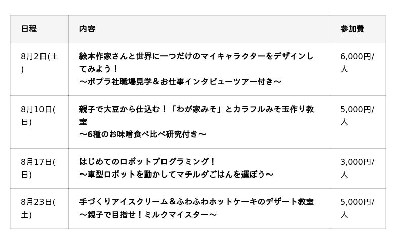 本イベントでは、子ども達の知的好奇心を育み、社会に興味をもつきっかけとなる体験を夏休みに提供したいというマチルダの想いの元、株式会社ポプラ社/東京地下鉄株式会社・東京メトロエデュケーショナル株式会社/森永乳業株式会社東京支社/佐野味噌醤油株式会社/三井不動産株式会社と共創し、各分野の専門家と一緒に楽しく体験・学習できる場を提供します。