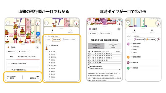 さらに今年は、山鉾の巡行順がひと目で分かるよう、マップ上のリストを巡行順に整理し初導入しました。各山鉾のスポットを選択すると、前後の山鉾情報へ遷移できる機能も昨年に引き続き実装しています。また、地下鉄の臨時運行情報も掲載し、移動の利便性向上を図っています。市営地下鉄については臨時時刻表まで表示し、京阪・阪急については案内テキストとリンクを設置予定です。