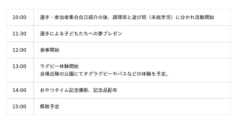 はじめて子ども食堂を訪問し、子どもたちと一緒にカレーライスを作って食べました。みんなで作る楽しさや、美味しさを共有できて心温まる時間でした。食後は公園でラグビー体験を行い、元気いっぱいにラグビーボールで遊びまわる姿にこちらも元気をもらいました。子どもたちの笑顔に触れ、ラグビーを通じて人とつながる喜びを私も子どもたちも実感してくれたと思います。今回のつながりや体験を大切にして、これからも地域との交流を継続していきたいと思います。子ども食堂NUKUNUKUの皆さん、ありがとうございました!