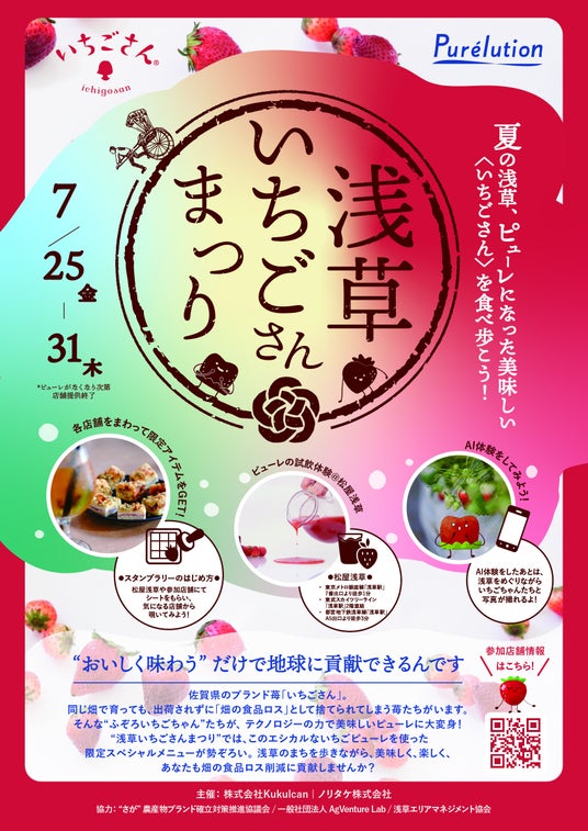 畑の食品ロスゼロを理念に掲げる株式会社Kukulkanとノリタケ株式会社がタッグを組み、規格外の「いちごさん」を使用したピューレを開発。今回、この「いちごさんピューレ」を使って、浅草の飲食店でも「いちごさん」メニューが展開されます。
