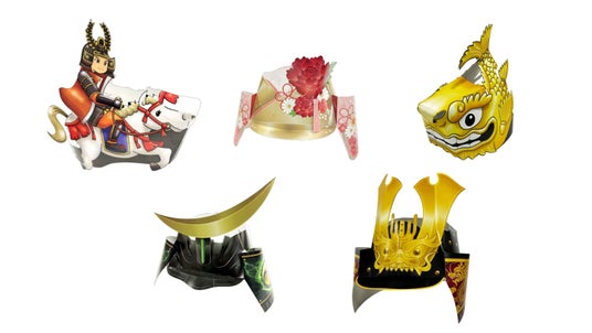 なりきり武将キャップ(各100円)親子で作って遊べる「なりきり武将キャップ」は、定番のカッコイイ兜から女の子向けのカワイイ兜、個性的な金シャチ兜など全部で5種類あります。自分で作った兜を被り館内を探検すれば、気分は戦国武将!