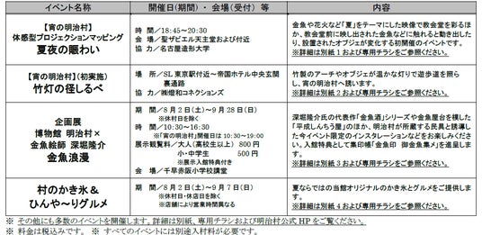 また、金魚絵師として名高い現代美術家・深堀隆介氏との4シーズン目のコラボレーション「企画展『博物館 明治村×金魚絵師 深堀隆介 金魚浪漫』」や「村のかき氷&ひんや~りグルメ」など、夏ならではの涼を楽しめるイベントを開催します。