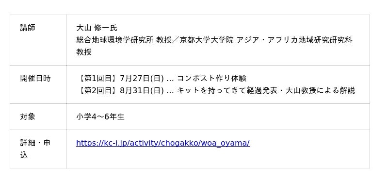 砂漠をゴミで緑化した大山修一教授から科学×エコを楽しく学べる子ども向けコンポストワークショップです。野菜の皮やごはんの残りで、ふかふかの土に大変身!?初めてでも大丈夫。見て・さわって・学べる夏休みの自由研究にもぴったりなエコ体験をしてみませんか?