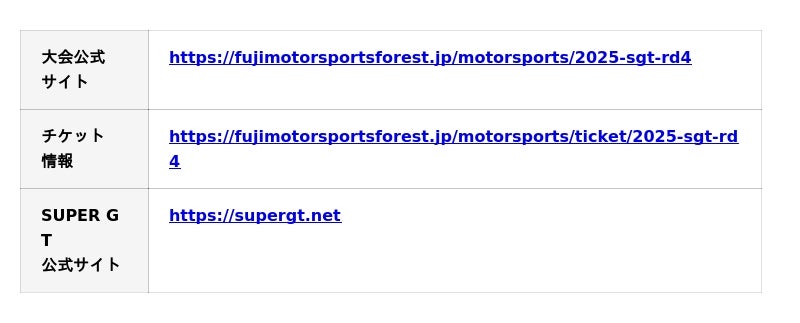 チケットサイト:https://fujimotorsportsforest.jp/motorsports/ticket/2025-sgt-rd4