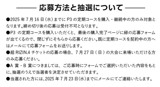 番組内で紹介されたQRコードまたはリンクからP3定期コースをご購入いただき、応募フォームよりエントリーされた方の中から、「超RIZIN.4 真夏の喧嘩祭り」観戦ペアチケットや、豪華サイン入りP3を抽選でプレゼント!