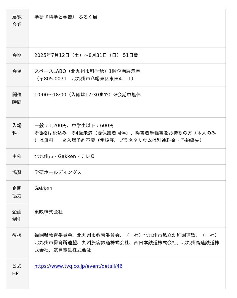 2026年春に創業80周年を迎える株式会社 学研ホールディングス(東京・品川/代表取締役社長:宮原 博昭)のグループ会社、株式会社 Gakken(東京・品川/代表取締役社長:南條達也、以下Gakken)は、2025年7月12日(土)より、創業者生誕の地、北九州にあるスペースLABO(北九州市科学館)にて、《学研『科学と学習』ふろく展》を開催いたします。